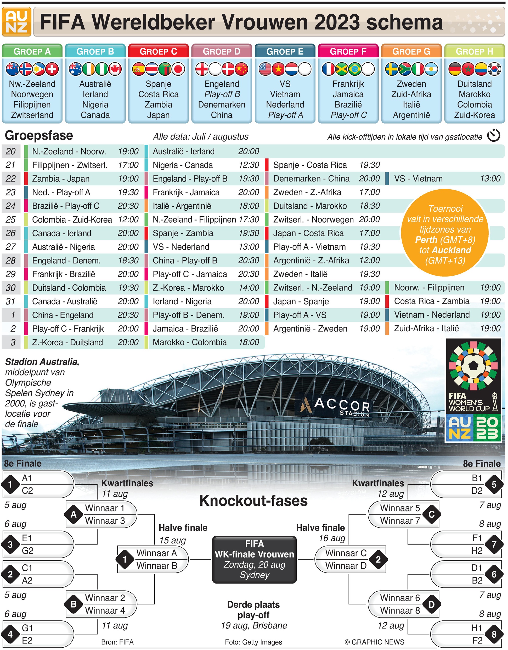 Gastland Nieuw-Zeeland opent het toernooi tegen Noorwegen in Eden Park in Auckland op 20 juli, terwijl regerend kampioen USA op 22 juli hun campagne tegen Vietnam begint. De finale vindt plaats in Stadium Australia, Sydney op 20 augustus.