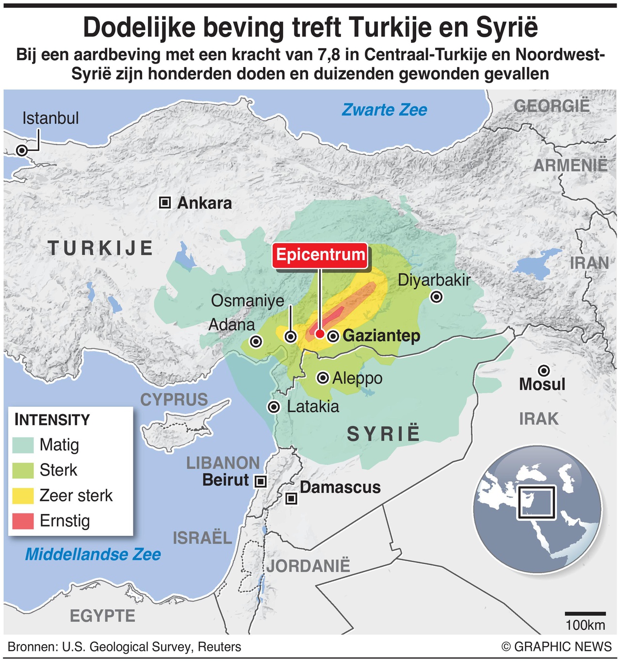 Bij een aardbeving zijn in het zuiden van Turkije zeker 1200 doden en duizenden gewonden gevallen. Er wordt gevreesd dat het dodental nog zal oplopen, in zowel Turkije als buurland Syrië liggen nog veel mensen onder het puin.
