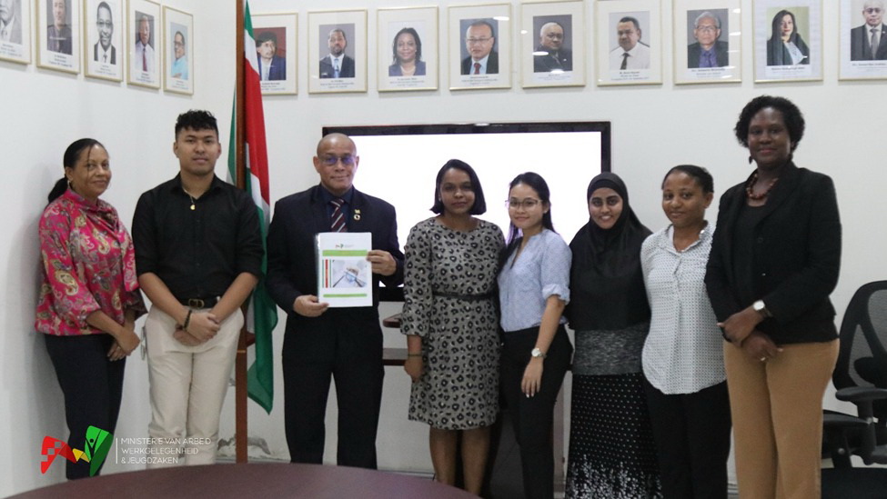 (Foto bijschrift: Het moment van aanbieding van de publicatie. Vlnr: Maureen Samuels (hoofdbeleidsmedewerkster Arbeidsmarktontwikkeling), Javier Samidin (medewerker Arbeidsstatistieken), minister Steven Mac Andrew, Tirlotma Marhe-Kewal (wnd hoofd Arbeidsstatitieken), Debra Wirjosentono en Shaneeza Nasroe (medewerksters Arbeidsstatistieken), Leanda Gravenstijn (hoofdbeleidsmedewerkster Arbeidsbemiddeling) en Naomi Esajas-Friperson (onderdirectrice Arbeidsmarkt).