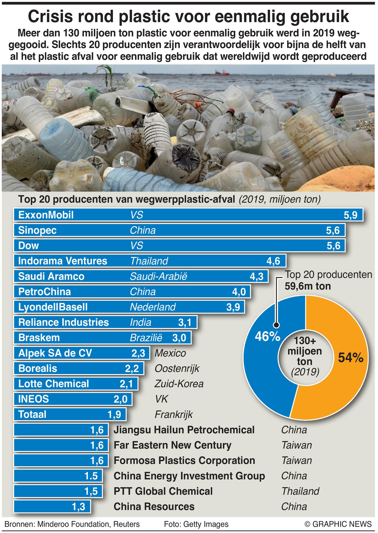 Het in de VS gevestigde ExxonMobil en Dow en het Chinese Sinopec voeren de lijst aan, waarbij deze drie bedrijven verantwoordelijk zijn voor 16 procent van het wereldwijde plastic afval voor eenmalig gebruik.