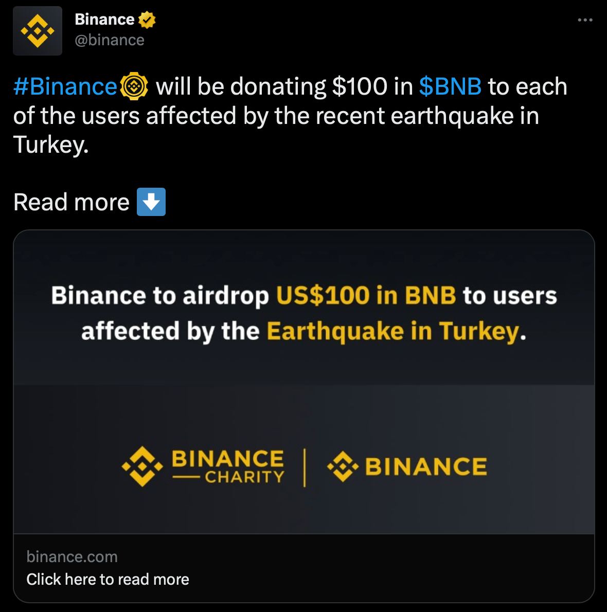 Binance gaat $100 airdroppen naar gebruikers in de aardbevingsregio van Türkiye