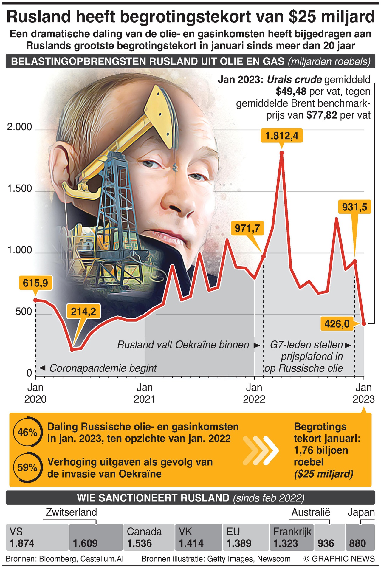 De Russische olie- en gasbelastinginkomsten daalden in januari met 46% in vergelijking met een jaar geleden, terwijl de uitgaven met 59% toenamen als gevolg van de invasie van Oekraïne.