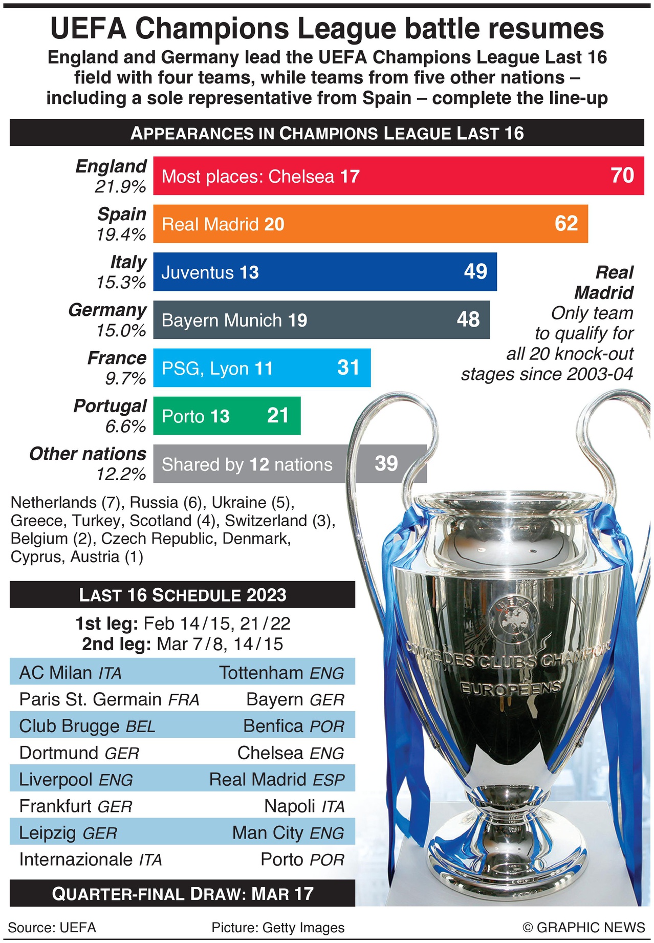 14 februari 2023 – 15 maart 2023 – De laatste 16 van de UEFA Champions League vinden plaats in heel Europa, terwijl het toernooi de knock-outfase bereikt. Engeland en Duitsland voeren de UEFA Champions League Last 16 aan met vier teams, terwijl teams uit vijf andere landen – waaronder een enige vertegenwoordiger uit Spanje – de line-up vervolledigen.
