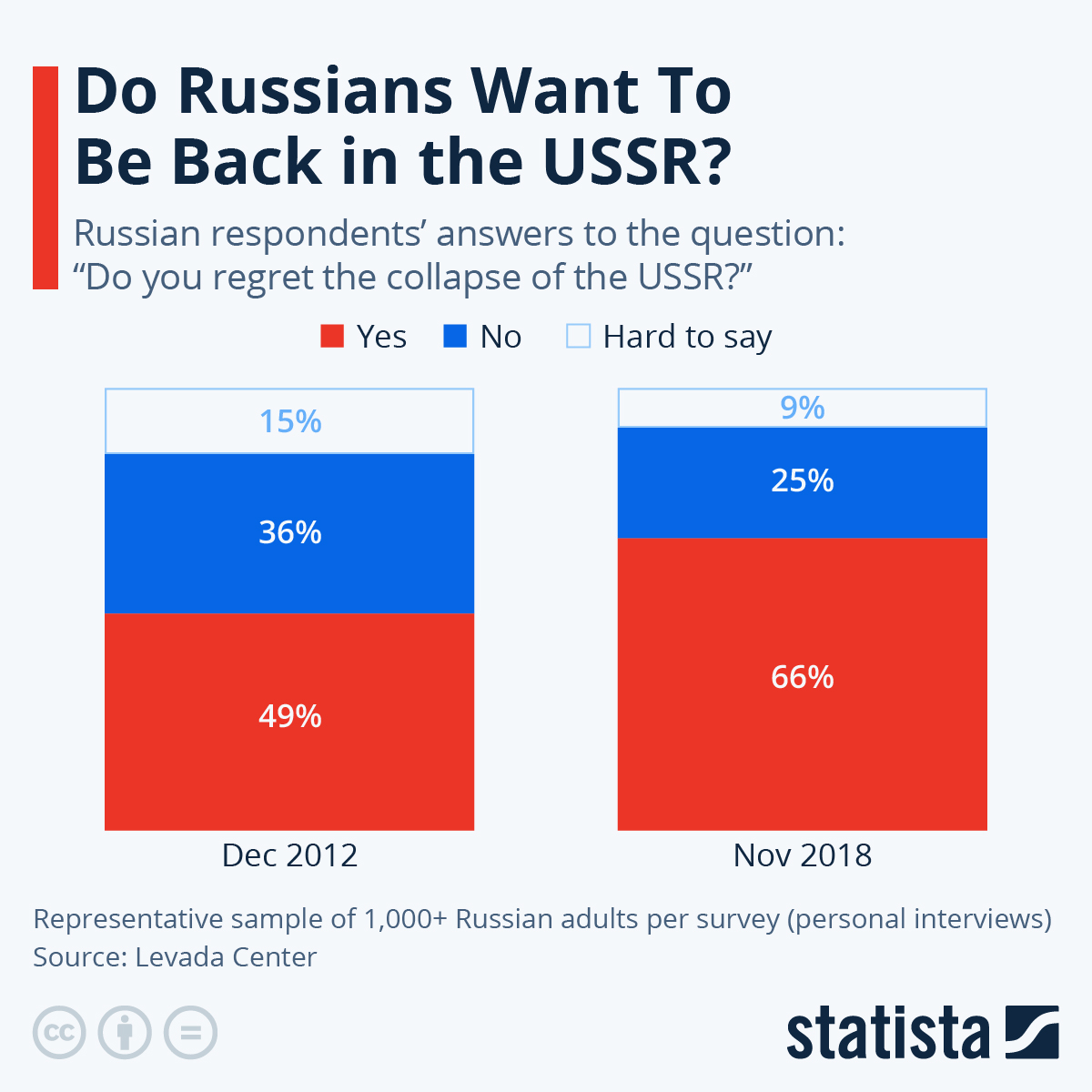 Uit gegevens van het Levada Center blijkt zelfs dat veel Russen nog steeds erg gesteld zijn op de USSR. In de laatste aflevering van een terugkerend onderzoek zei tweederde van de Russen in 2018 dat ze spijt hadden van de val van de Sovjet-Unie, tegen ongeveer de helft in 2012 en ongeveer evenveel als na de ondergang van het land begin jaren negentig.