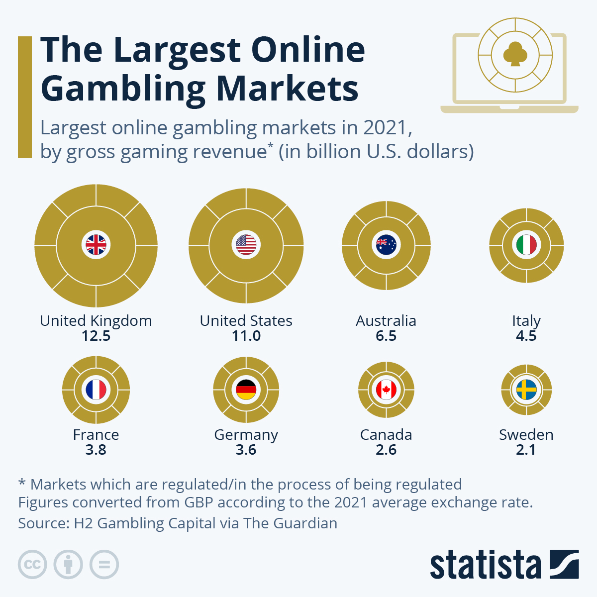 Zelfs als men zich bewust is van de aanzienlijke kosten die gokverslaving heeft voor de regering en de samenleving van het Verenigd Koninkrijk, kan de schaal van de industrie in het land als een verrassing komen. Zoals gegevens van H2 Gambling Capital, geciteerd door The Guardian, laten zien, is het VK de grootste gereguleerde online gokmarkt ter wereld – en op enige afstand. Met een totale bruto gaming-omzet van $ 12,5 miljard in 2021 overtreft de Britse markt zelfs de Verenigde Staten ($ 11,0 miljard).
