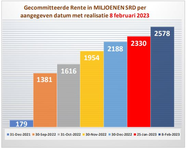 De totale gecommitteerde rente is met de veiling deze week gestegen naar SRD 2.578 miljoen. Dit zijn de totale rentelasten die aan de algemene banken moeten worden uitbetaald sedert de TD-veilingen in juni 2021 zijn geĆÆntroduceerd.