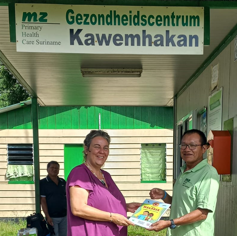 Op vrijdag 3 februari 2023 bezocht een team van het Malaria Programma van het Ministerie van Volksgezondheid het dorp Kawemhakan/Anapaike waar de overdracht plaats vond van 250 kinderboekjes over malaria in de Wayana-taal. Deze boekjes zijn bedoeld voor de Wayana dorpen aan de Lawa rivier. Katia Delvoye, BCC Coördinator van het malaria programma en auteur van het boekje, deed de overhandiging aan Stamhoofd Ipomadi ‘Miep’ Pelenapin.