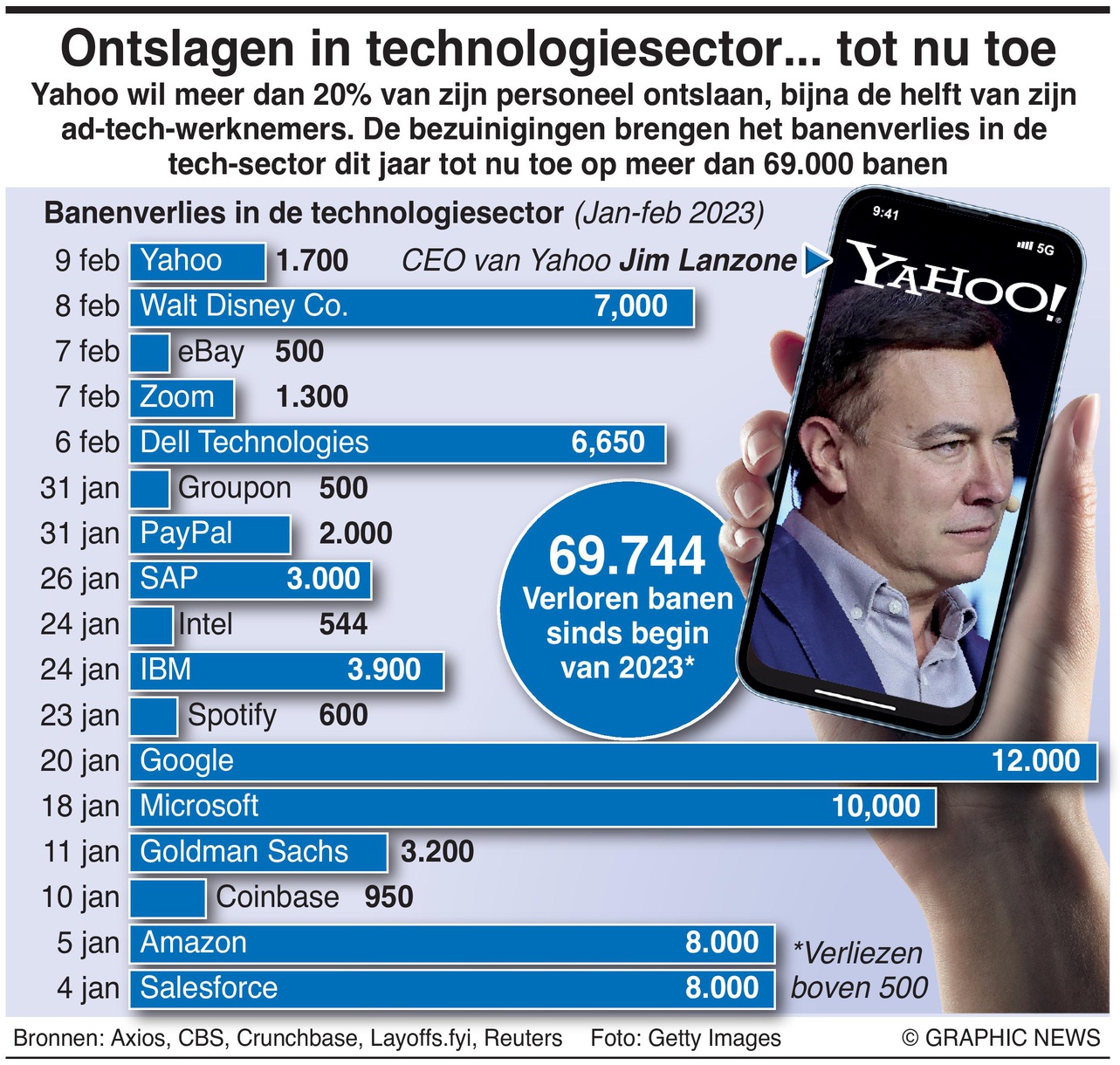 Yahoo is van plan meer dan 20% van zijn personeelsbestand te ontslaan, waardoor bijna de helft van zijn adtech-medewerkers wordt getroffen. De bezuinigingen leiden dit jaar tot meer dan 69.000 banenverlies in de technische sector.