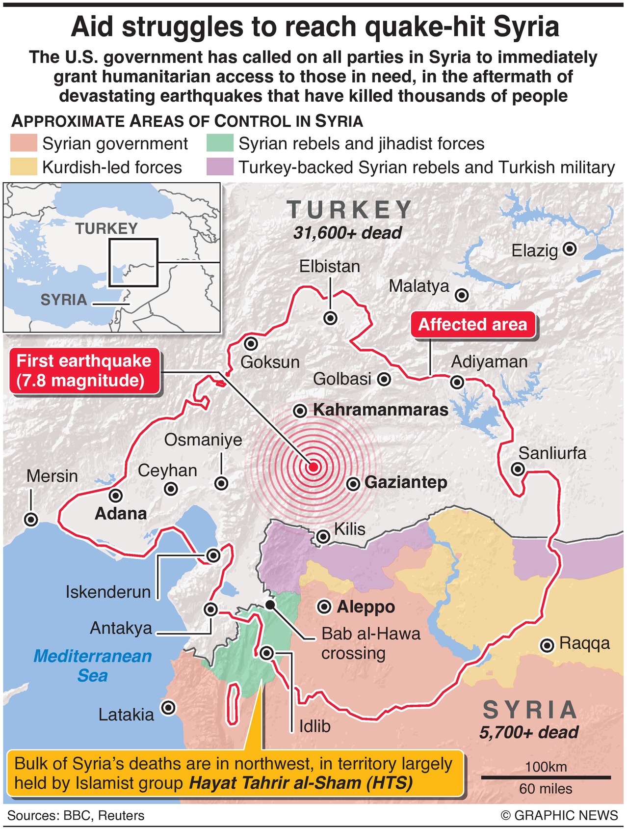 Een woordvoerder van de Verenigde Naties zei zondag dat hulp bij aardbevingen vanuit door de regering gecontroleerde delen van Syrië naar door de oppositie gecontroleerd gebied is opgehouden door “goedkeuringsproblemen” met een hardline-groep. Het probleem vormt een extra uitdaging voor hulpverleners die proberen de noordelijke regio’s te bereiken die zijn getroffen door de aardbeving van afgelopen maandag, aldus Reuters.