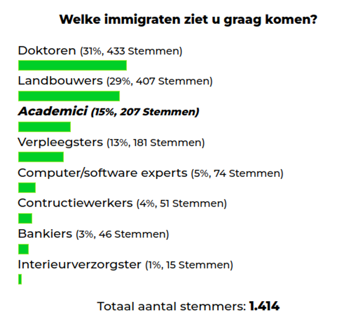 Uit een recent gehouden poll op de website van Dagblad Suriname waarin lezers en volgers van de krant werd gevraagd welke immigranten zij graag zien komen, blijkt dat men bijvoorbeeld liever artsen ziet komen dan academici.