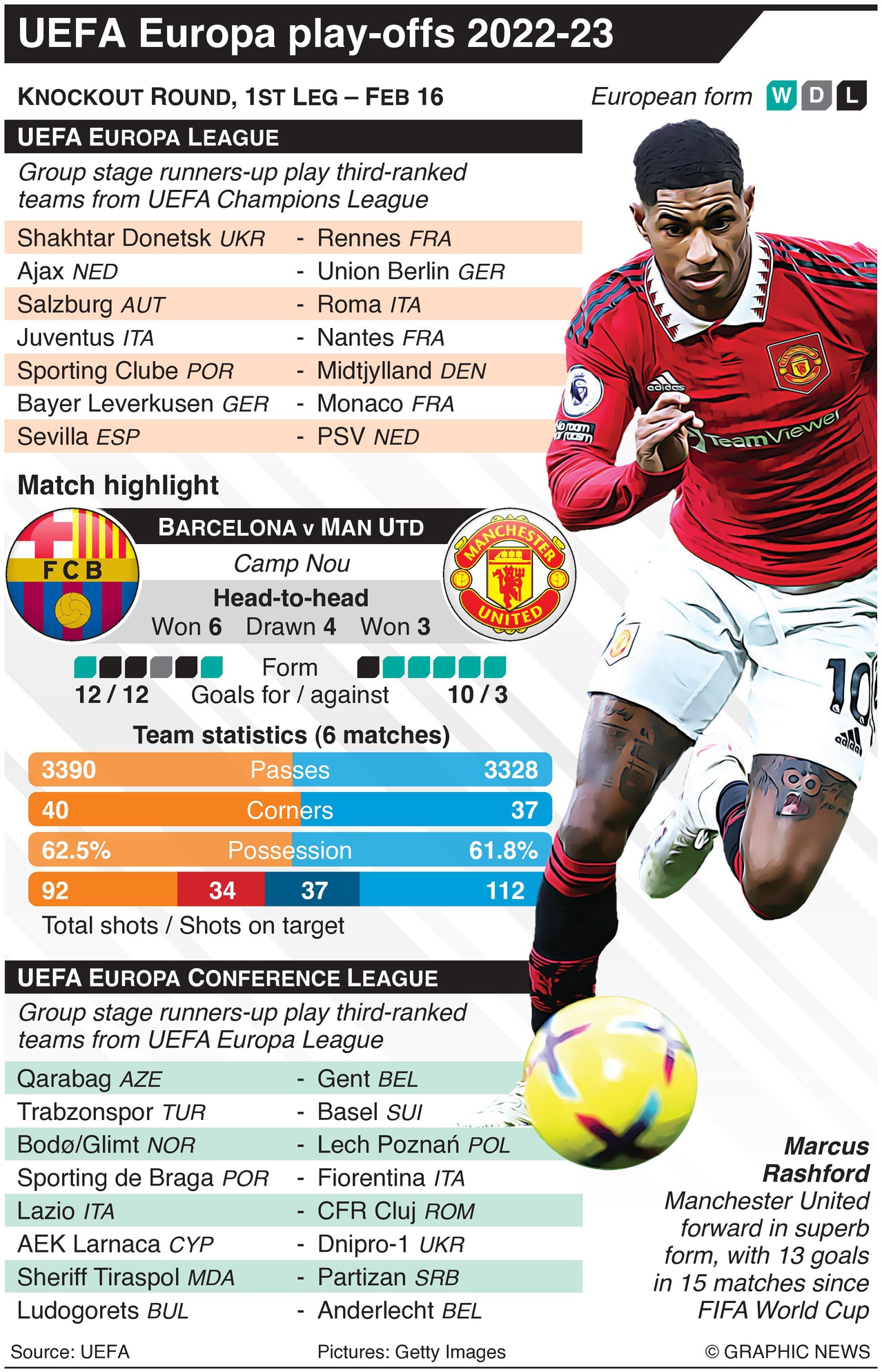 In de UEFA Europa League spelen de nummer twee van de groepsfase tegen teams die op de derde plaats staan van de UEFA Champions League. Belangrijke wedstrijden zijn onder meer een zwaargewichtgevecht tussen Barcelona – voor het tweede achtereenvolgende seizoen uitgeschakeld in de Champions League – tegen Manchester United, met spits Marcus Rashford in uitstekende vorm, die 13 doelpunten scoorde in 15 wedstrijden sinds de FIFA Wereldbeker. Elders neemt Ajax het op tegen Bundesliga-titelkandidaten Union Berlin en Juventus tackelt Nantes, nog steeds aan het bijkomen van hun 15-punten aftrek in de Serie A.