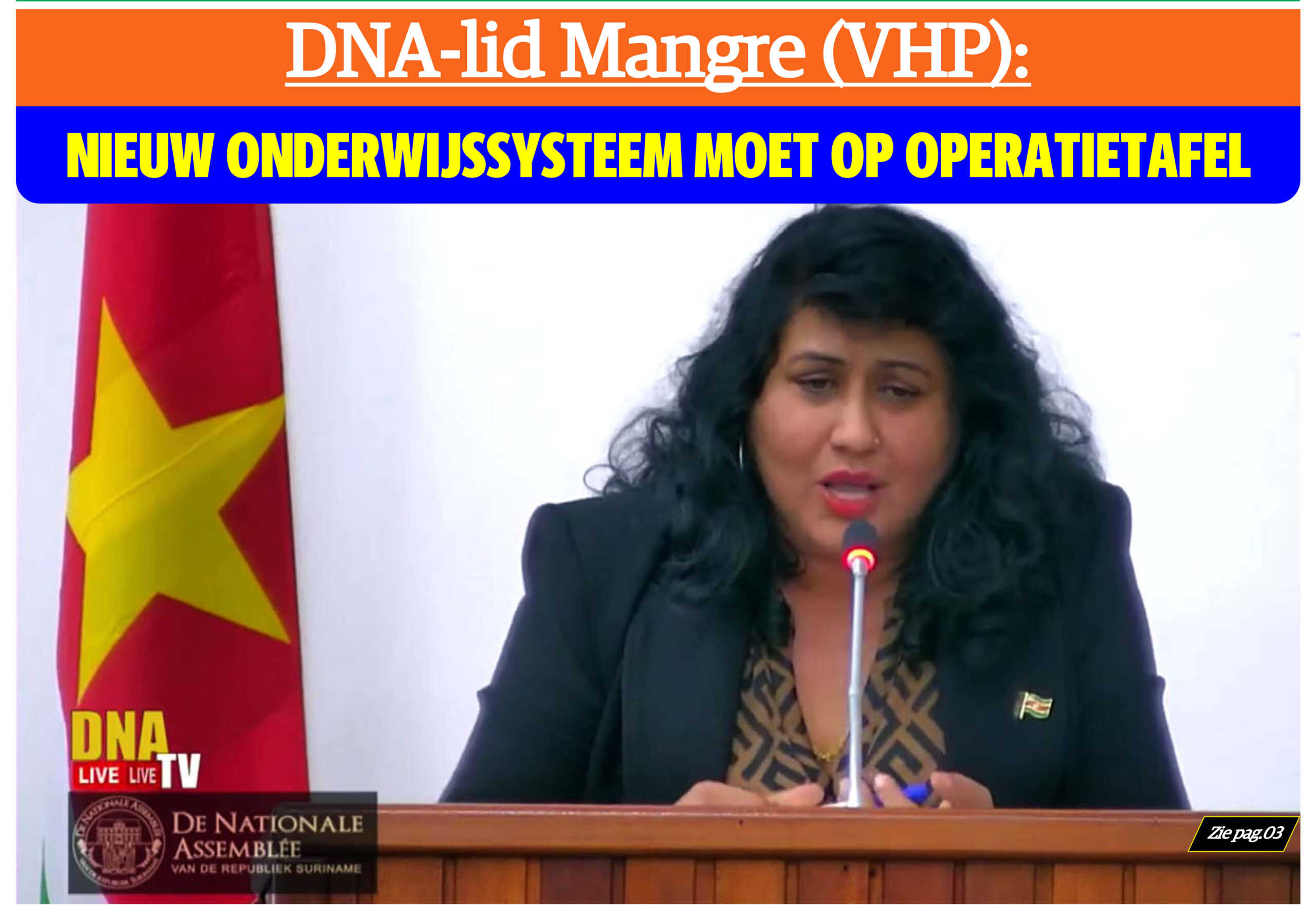 Het Assembleelid Reshma Mangre (VHP) is van oordeel, dat het nieuw onderwijssysteem op de operatietafel gelegd moet worden. Er is in de voorbije periode veel kritiek geleverd door Assembleeleden, ouders en verzorgers. Er moet nagegaan worden wat mis gaat en wat goed loopt, wat de sterke kanten zijn en de minder sterke kanten.