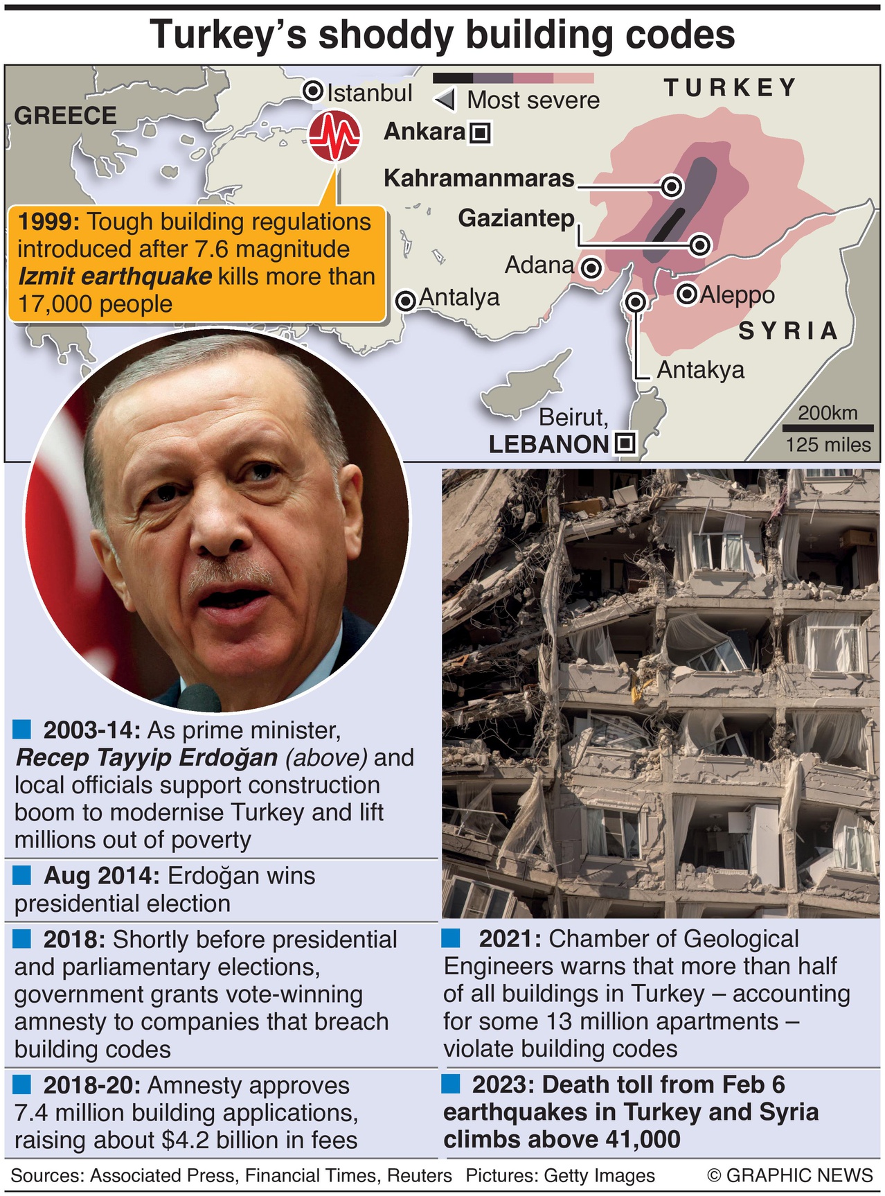 15 februari 2023 – President Recep Tayyip Erdoğan wordt geconfronteerd met een terugslag voor het toezicht houden op een amnestie van 2018 voor fouten in miljoenen gebouwen in heel Turkije. Binnen 18 maanden keurde de regering van Erdoğan 7,4 miljoen aanvragen goed, waardoor gebouwen een legale status kregen die de bouwvoorschriften en veiligheidsregels hadden geschonden.