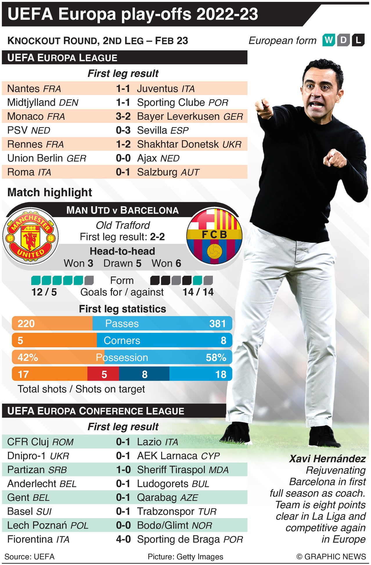 In de UEFA Europa League spelen de nummer twee van de groepsfase tegen teams die op de derde plaats staan van de UEFA Champions League. Belangrijke wedstrijden zijn onder meer een zwaargewicht duel tussen Manchester United – een aanval op de Premier League, FA Cup en Engelse League Cup, evenals de Europa League – tegen Barcelona, waarbij coach Xavi het team verjongt in het eerste volledige seizoen als coach. Elders neemt Ajax het op tegen Bundesliga-titelkandidaten Union Berlin en Juventus tackelt Nantes, nog steeds aan het bijkomen van hun 15-punten aftrek in de Serie A.