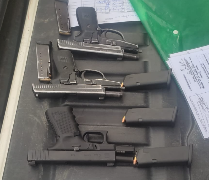 Bij de Saronbrug werden in de auto van D.D. aangetroffen en inbeslaggenomen 3 vuistvuurwapens met 4 patroonhouders en 51 patronen.