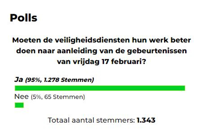 Op de website van Dagblad Suriname werd een poll met de vraag “moeten de veiligheidsdiensten hun werk beter doen naar aanleiding van de gebeurtenissen van vrijdag 17 februari”, binnen korte tijd door 1.343 mensen – volgers en lezers van Dagblad Suriname –  ingevuld. Daarvan hebben maar liefst 1.278 personen de optie, het antwoord, “Ja” aangevinkt (95 procent). Slechts 65 personen (5%) vindt dat de veiligheidsdiensten hun werk niet beter hoeven te doen en zijn kennelijk tevreden met hun werk.