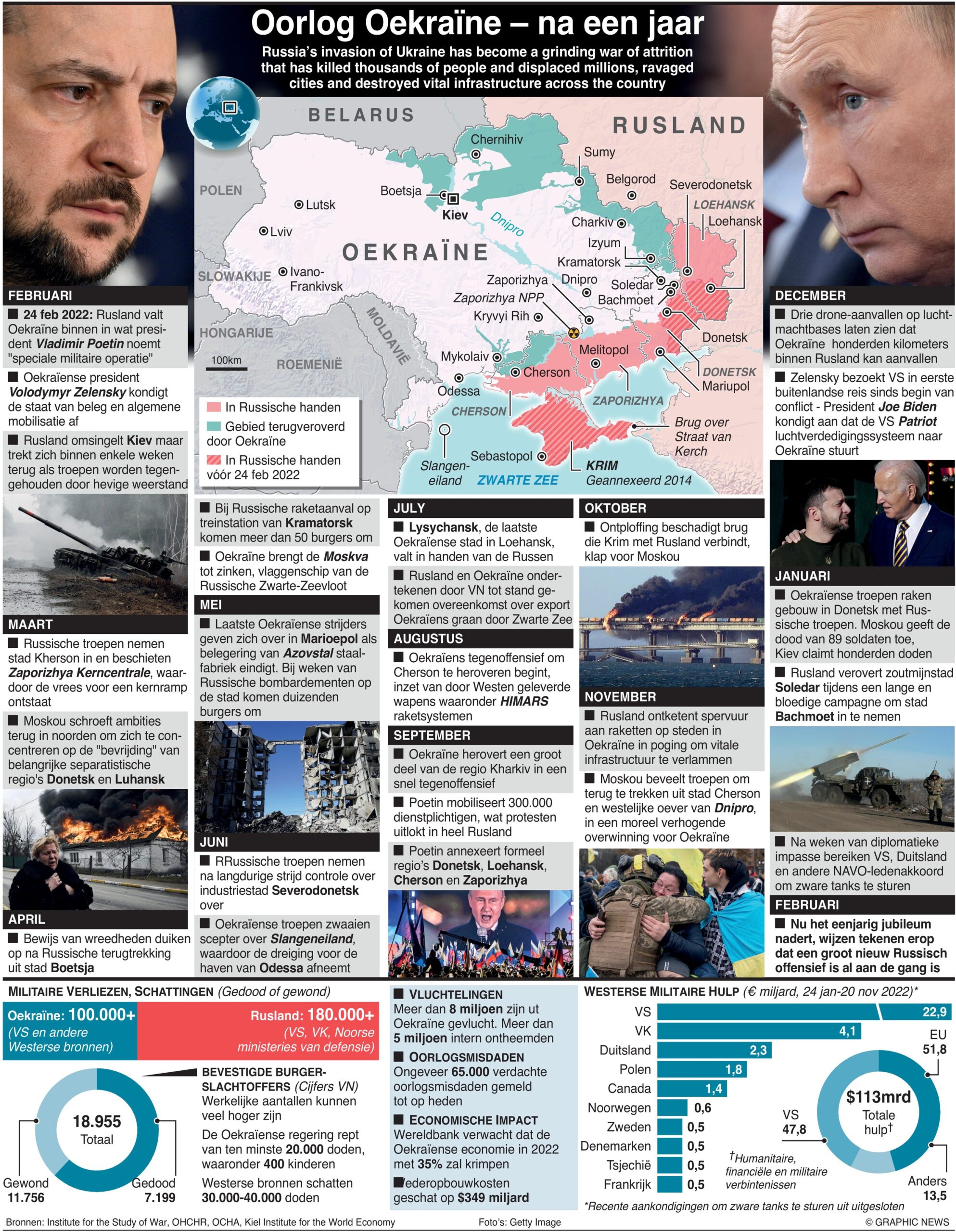 February 24, 2023 – De Russische invasie van Oekraïne is uitgegroeid tot een slopende uitputtingsslag die duizenden mensen heeft gedood en miljoenen heeft verdreven, steden heeft verwoest en vitale infrastructuur in het hele land heeft vernietigd.