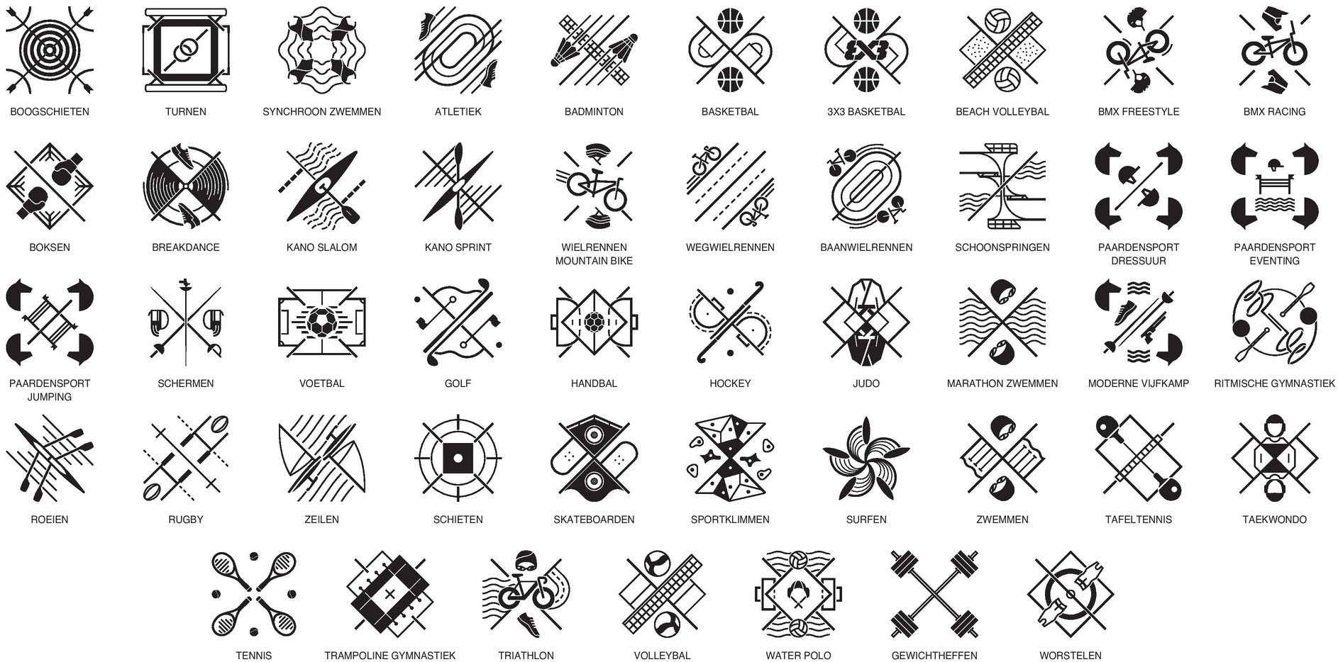 De 62 iconen van de Olympische en Paralympische disciplines (de Paralympics zullen een aantal Olympische iconen hergebruiken) zijn ontworpen in de stijl van een wapenschild, bedoeld om te functioneren als eretekens, die de “uitverkoren sportieve familie” van de drager onthullen.