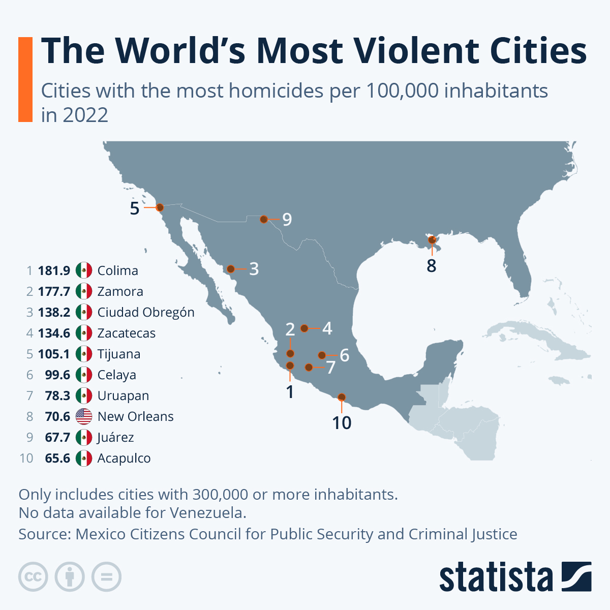 Van de 50 meest gewelddadige steden ter wereld liggen er 38 in Latijns-Amerika, waaronder 17 in Mexico. De Mexico Citizens Council for Public Security and Criminal Justice publiceert elk jaar zijn bevindingen over het aantal moorden in steden met meer dan 300.000 inwoners over de hele wereld. Deze infographic toont de top 10 van meest gewelddadige steden ter wereld, met de Mexicaanse stad Colima op de eerste plaats en New Orleans in de Amerikaanse staat Louisiana op de achtste plaats. Caracas, de hoofdstad van Venezuela, stond in eerdere edities op de eerste plaats, maar door de situatie in het land zijn er geen gegevens meer beschikbaar. Het merendeel van het geweld in Latijns-Amerika kan worden toegeschreven aan drugshandel, bendeoorlogen en politieke instabiliteit.