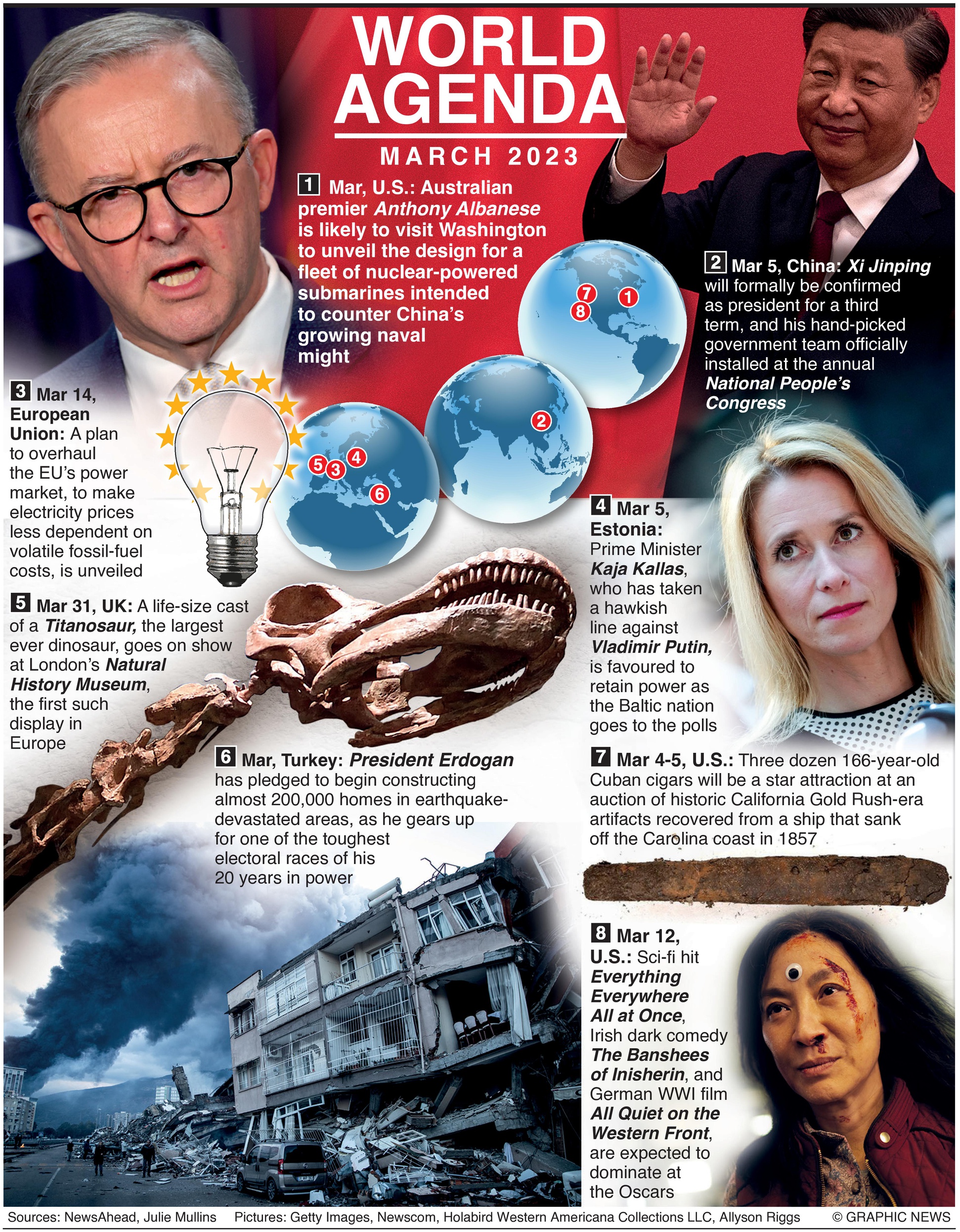1 maart 2023 – 31 maart 2023 – Evenementen in maart zijn onder meer de onthulling van het ontwerp voor een vloot van Australische nucleair aangedreven onderzeeĆ«rs, de bevestiging van de derde ambtstermijn van president Xi Jinping en de allereerste weergave van een levensgrote Titanosaurus in Europa.