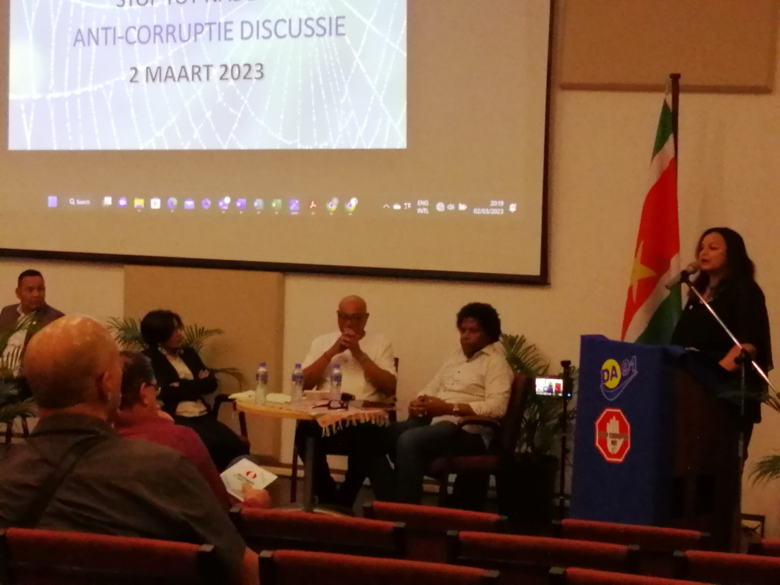 De discussieavond heeft tot doel om ideeën en kennis met elkaar te delen en transformatief denken voor een succesvolle aanpak van corruptie te bereiken. Een deskundig panel, bestaande uit fiscalist Stanley Esajas, onderneemster Maya Matawlie en journalist Glenn Truideman, gaf een uiteenzetting om te komen tot verbetering.