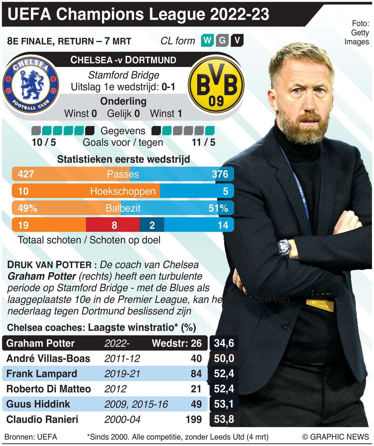 7 maart 2023 – UEFA Champions League-ronde van 16 terugwedstrijdwedstrijden, inclusief duels tussen Chelsea en Borussia Dortmund op Stamford Bridge. De loting voor de kwartfinales van de UEFA Champions League vindt plaats op 17 maart in Nyon, Zwitserland.