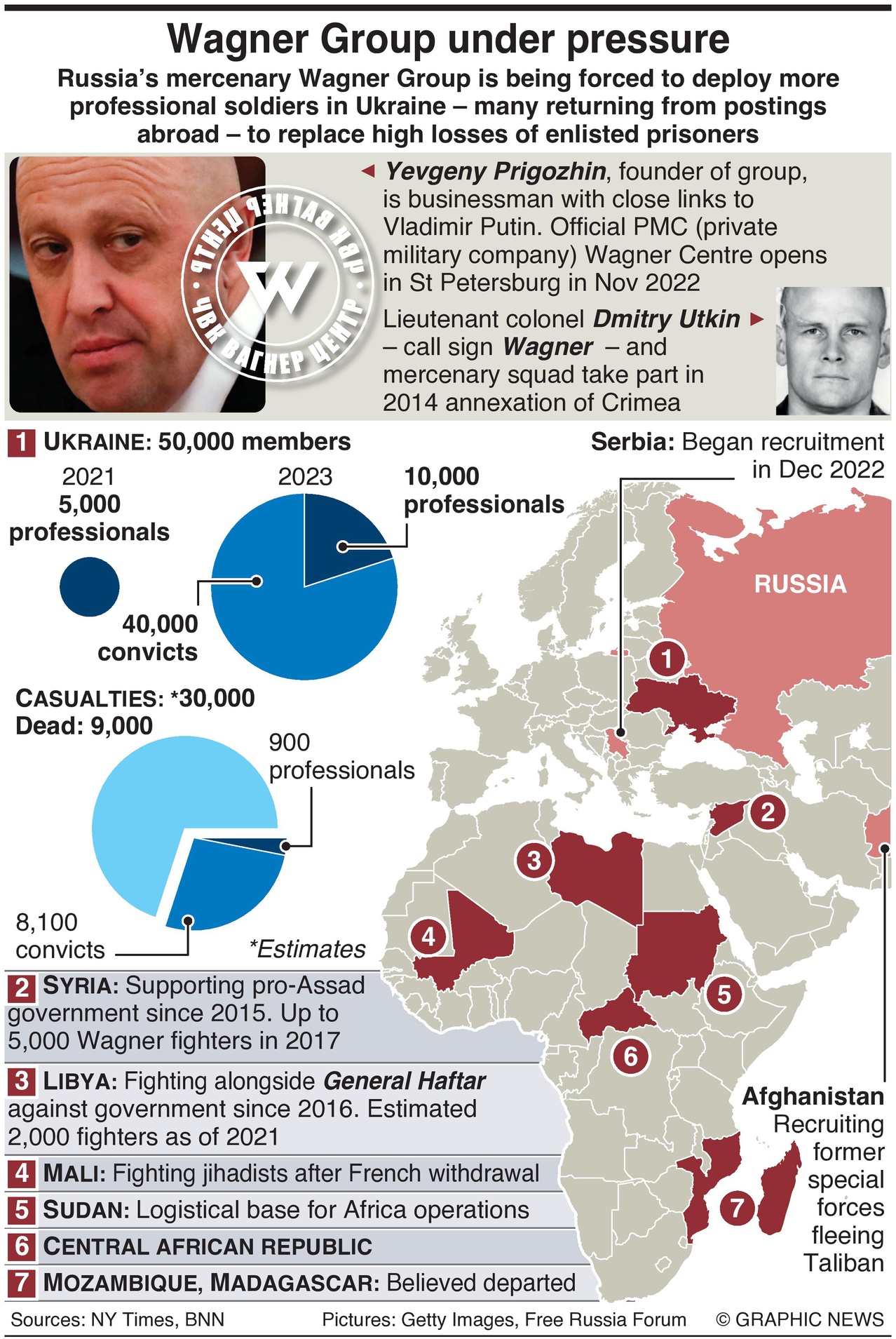 Hoewel particuliere militaire groepen worden verboden uit deelname aan “gewapend conflict in het buitenland voor financieel gewin”, werkt Wagner sinds december 2022 openlijk in Rusland en wordt door de Russische regering gebruikt om het Russische beleid te projecteren – met plausibele ontkenning – met name in Syrië en Afrika.
