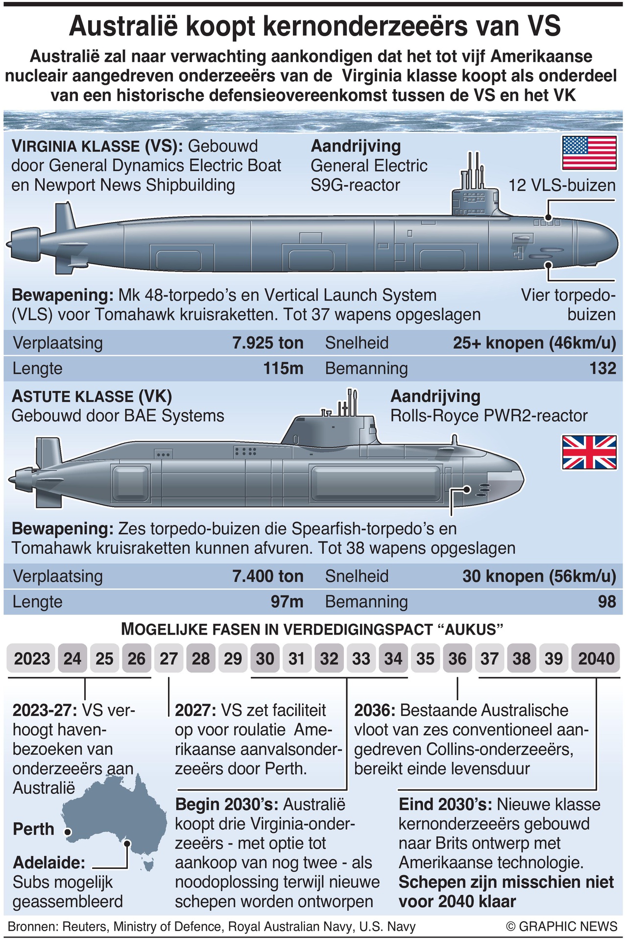 13 maart 2023 – AustraliĆ« zal naar verwachting aankondigen dat het maximaal vijf Amerikaanse Virginia-klasse nucleair aangedreven onderzeeĆ«rs zal kopen als onderdeel van een baanbrekende defensieovereenkomst tussen de VS en het VK.