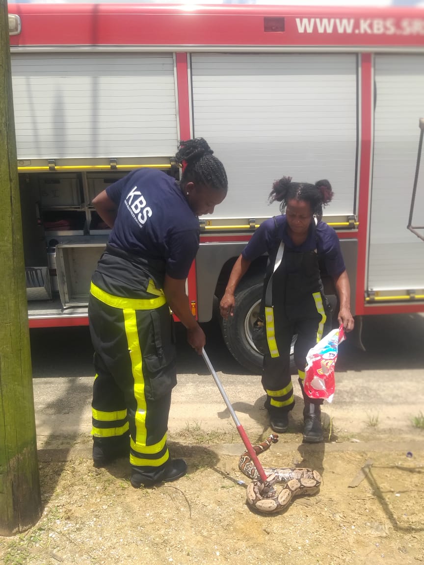 Op het schoolterrein van OS Tammenga-Projekt hielden leerkrachten en leerlingen afgelopen donderdag even de adem in nadat iemand een tapijtslang of boa constrictor had gesignaleerd. Terwijl de leerlingen de klassen uit wilden, moest schooldirectrice Jacintha Zinhagel iedereen sommeren om binnen te blijven. De slang zocht ondertussen een veilige plek onder een geparkeerde auto van een leerkracht, wat voor nog meer paniek zorgde.