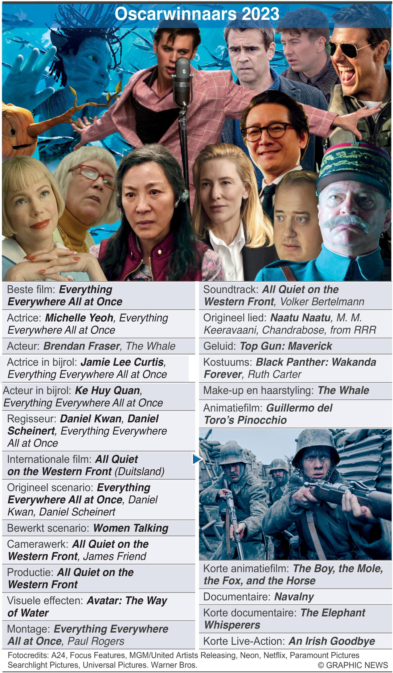 13 maart 2023 – “Everything Everywhere All at Once” domineerde de 95e Academy Awards en won zondagavond zeven Oscars.
