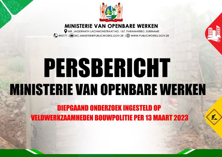 Het ministerie van Openbare Werken (OW) krijgt al geruime tijd klachten binnen over de veldwerkzaamheden van de Bouwpolitie en veldcontroleurs. In dit kader heeft minister Riad Nurmohamed per 13 maart onmiddellijk een diepgaand onderzoek ingesteld in verband met mogelijke afpersing door de Bouwpolitie van burgers.