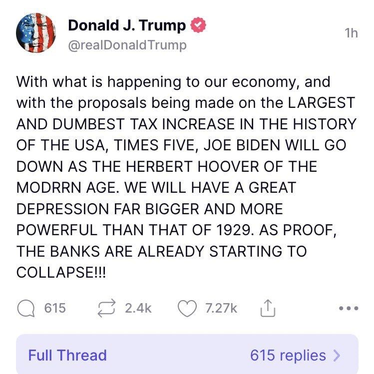 “We zullen een Grote Depressie krijgen – veel groter en krachtiger dan die in 1929 begon. Het bewijs is dat banken al beginnen in te storten!”, schreef de ex-president op zijn Truth Social-netwerk.