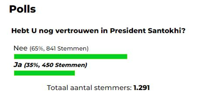 1.291 personen hebben in een dag of twee gereageerd op een poll op de website van Dagblad Suriname, waarin aan lezers en volgers van de krant werd gevraagd of men nog wel vertrouwen heeft in president Chandrikapersad Santokhi. Van dat aantal gaf 65 procent aan geen vertrouwen meer te hebben in de president (841 stemmers), tegenover 430 personen die nog wel dat vertrouwen hebben, ofwel 35%.