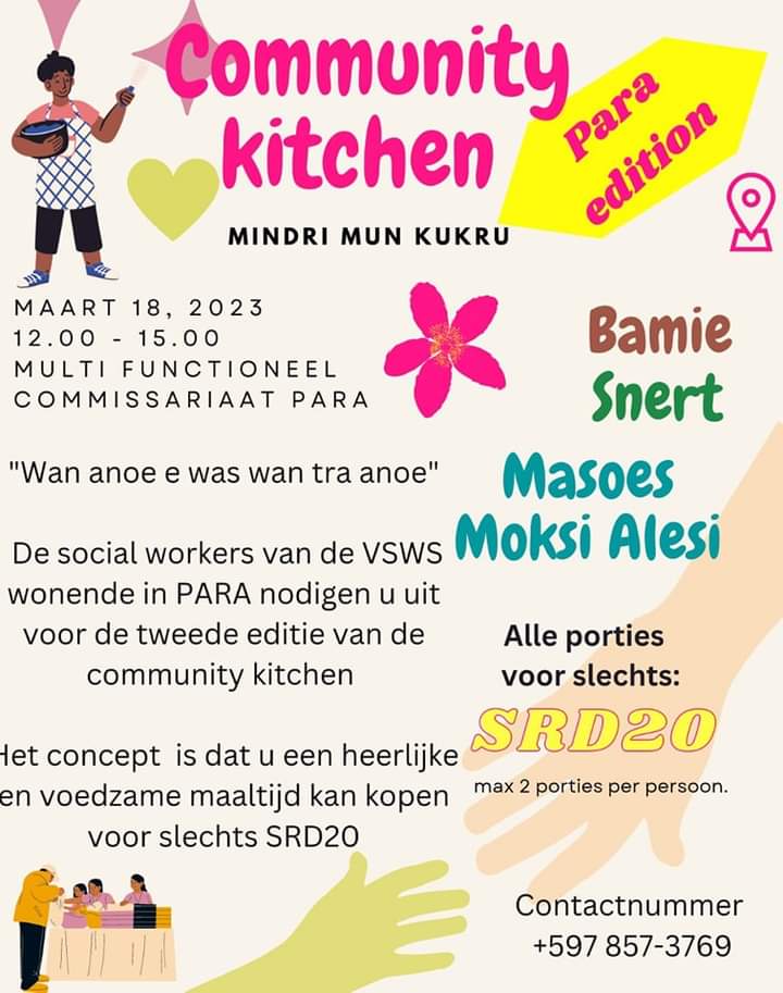 De sociaal werkers van de VSWS (Vereniging van Sociaal Werkers in Suriname) houden morgen, zaterdag 18 maart, de tweede editie van de community kitchen in het Multi Functioneel Centrum te Para.