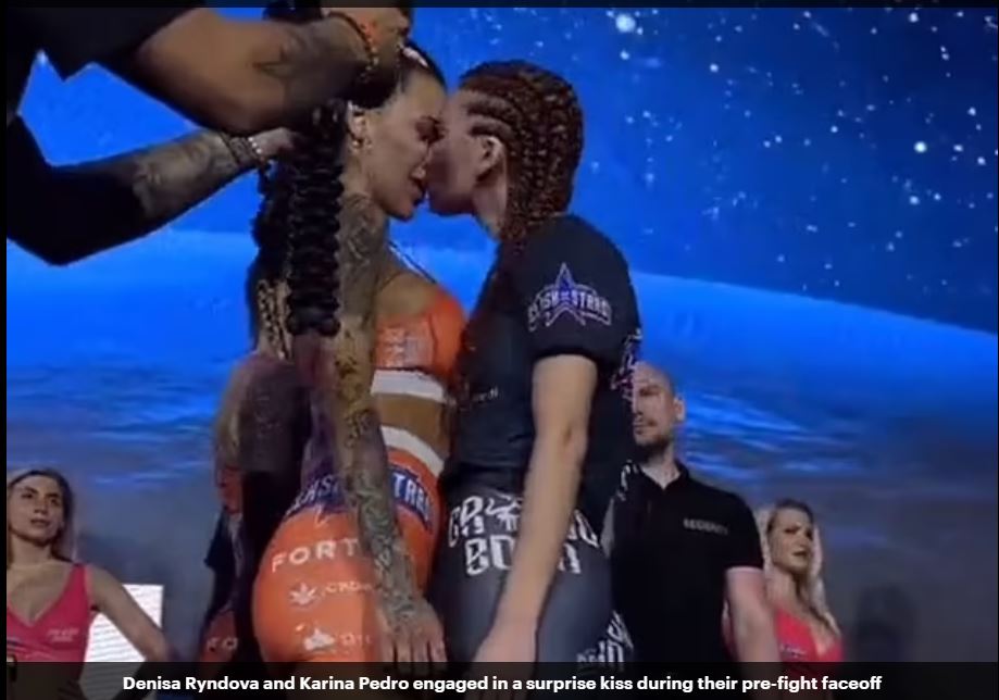 Twee Tsjechische modellen waren vorige week bezig met een brutale kus tijdens een confrontatie voorafgaand aan een Clash of the Stars-gevecht.