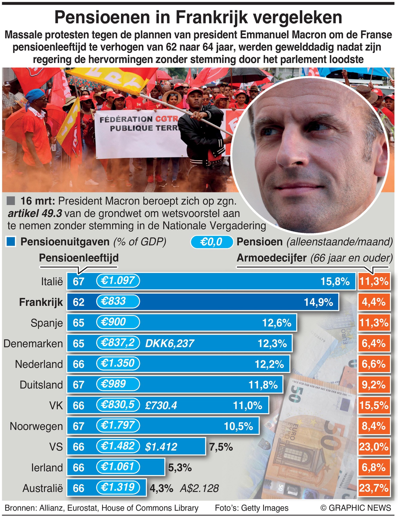 Massale protesten tegen de plannen van president Emmanuel Macron om de pensioengerechtigde leeftijd van Frankrijk te verhogen van 62 naar 64 werden gewelddadig nadat zijn regering hervormingen zonder stemming door het parlement had geduwd.
