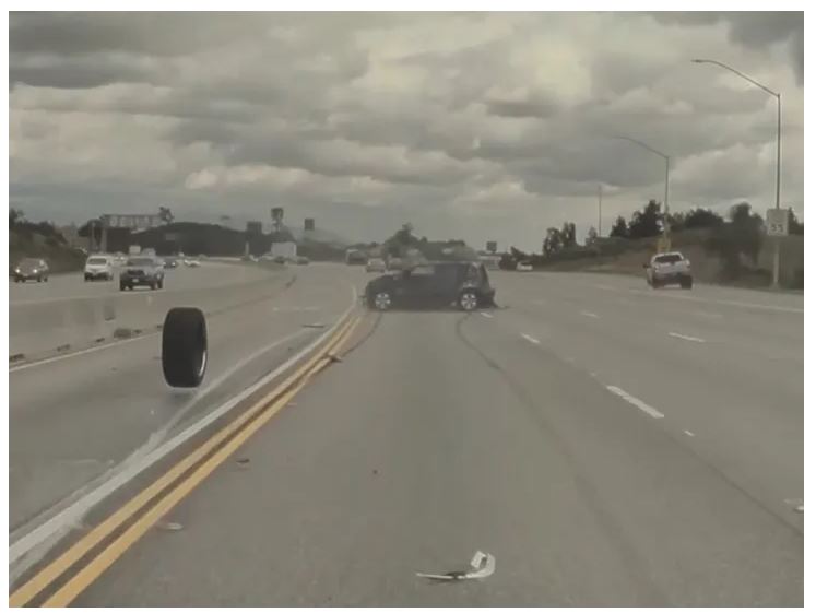 Dashcam-video gefilmd door Tesla van Anoop Khatra heeft een ongelooflijk ongeval op de Ronald Reagan Freeway in L.A. vastgelegd. De linker voorband van de pick-up kwam los, waarna de losse band de Kia Soul de lucht in stuurde. De Kia maakte een salto in mid-air voordat hij landde. Er werden geen grote verwondingen gerapporteerd, maar de chauffeur van de pick-up slaagde erin om angstig de snelweg af te rijden met maar 3 wielen.