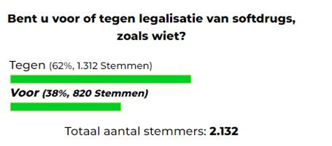In een recente poll op de website van Dagblad Suriname werd de vraag aan volgers en lezers van de krant gesteld, of zij vinden dat softdrugs gelegaliseerd zouden moeten worden. Van de 2.132 personen die de poll hebben ingevuld heeft maar liefst 62 procent, 1.312 stemmers, aangegeven tegen legalisering te zijn. 820 personen (38%) zijn voor legalisatie van softdrugs, zoals wiet, hasj en marhuana,