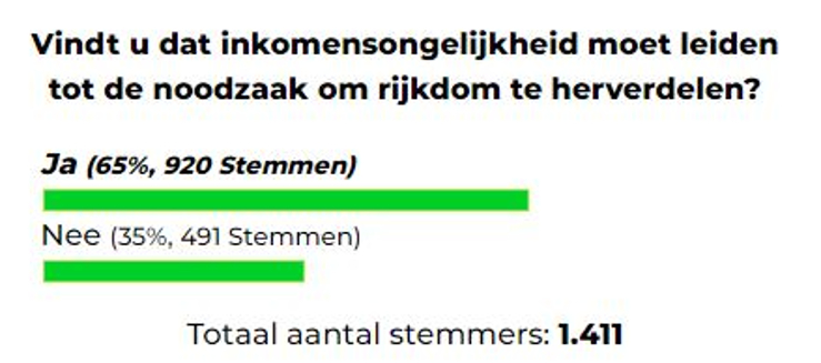 In totaal hebben 1.411 mensen op de poll gereageerd en daarvan heeft 63 procent, 920 personen, de optie “Ja” aangevinkt, met andere woorden, zij vinden dus dat inkomensongelijkheid zou moeten leiden tot de noodzaak om rijkdom te herverdelen. 491 stemmers zien dat anders en hebben als antwoord “Nee” aangevinkt, 35%.