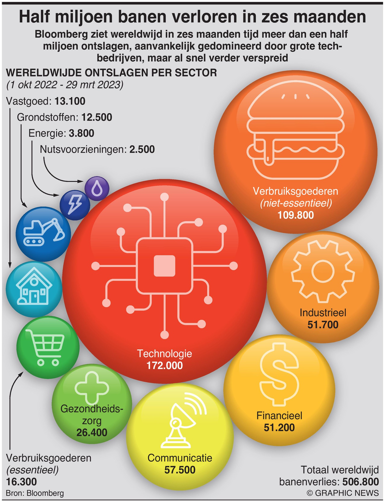 Bloomberg heeft in zes maanden tijd wereldwijd meer dan een half miljoen banen geschrapt, aanvankelijk gedomineerd door grote technologiebedrijven, maar al snel verspreidde het zich verder.
