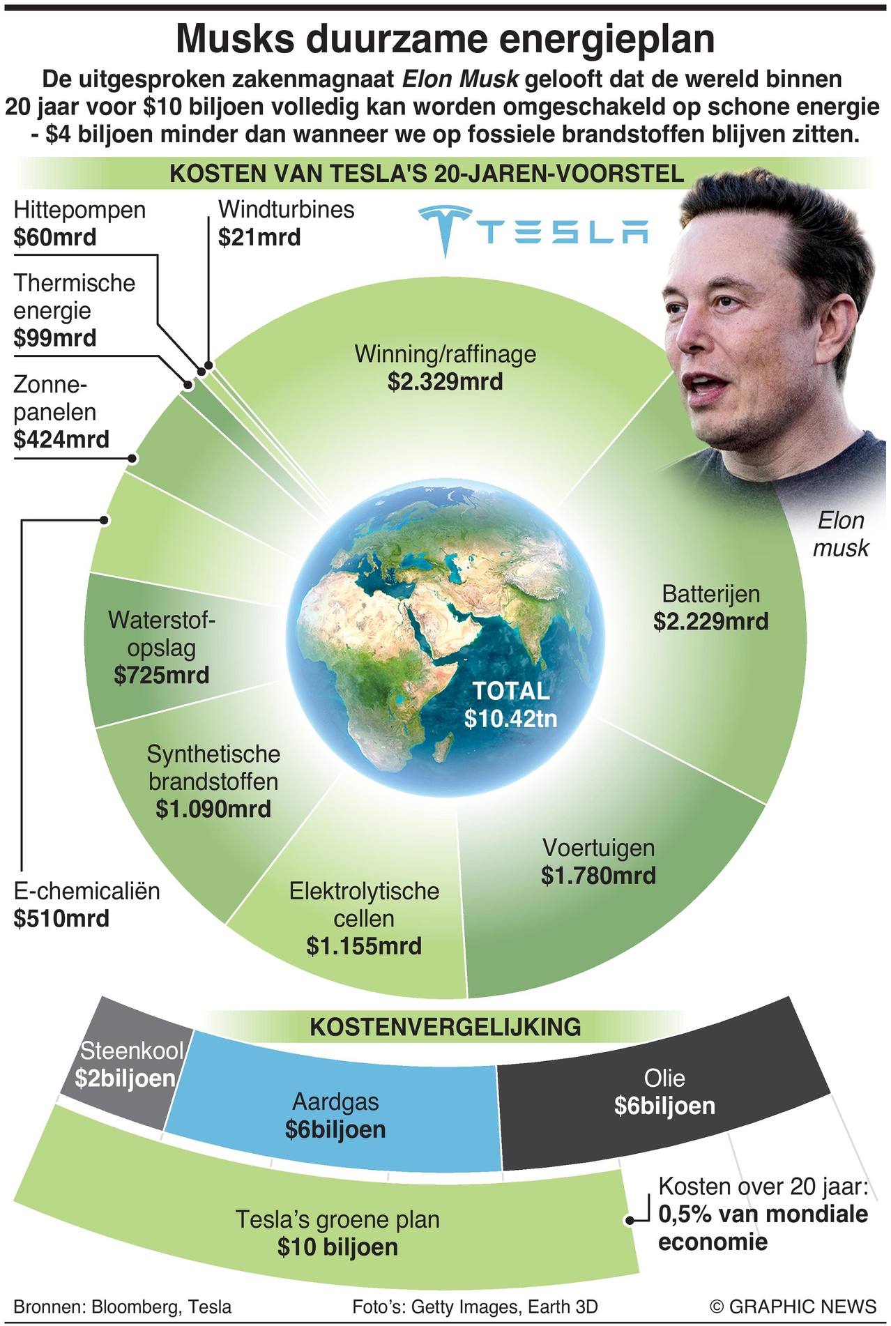 Hoewel de investeringskosten van 10 biljoen dollar van een schonere wereld hoog zijn, zegt Musk dat dit een fractie is van de wereldeconomie van 100 biljoen dollar, en nog minder als het wordt gespreid over twee decennia – 0,5% van de wereldeconomie.