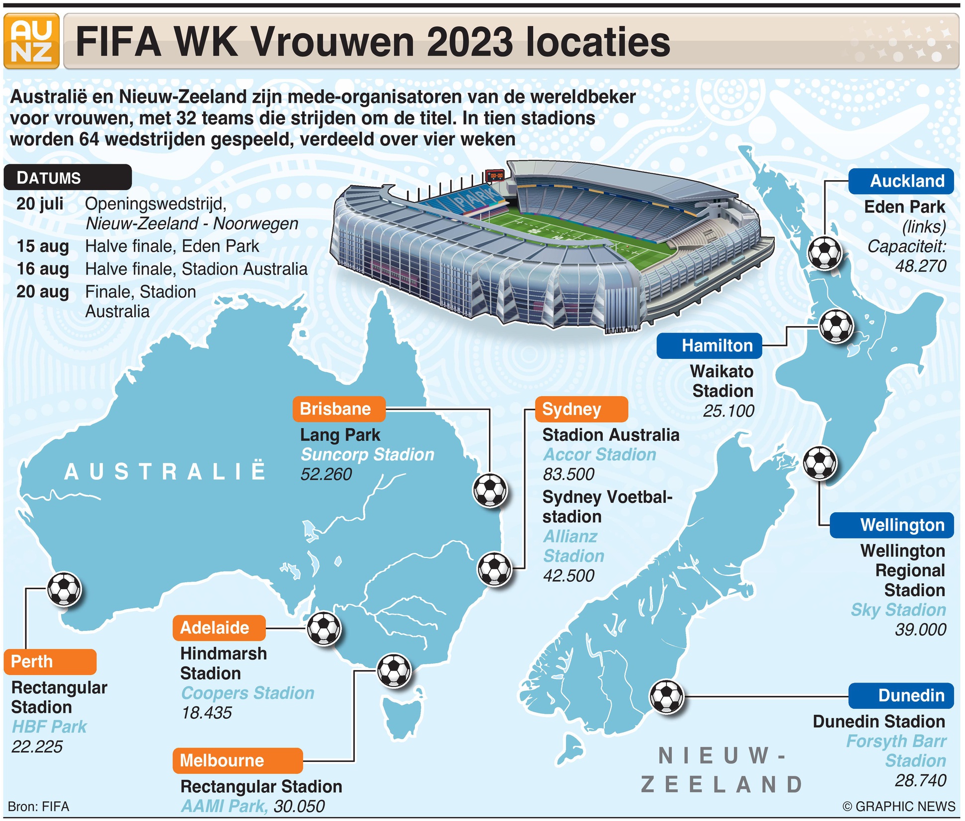 In tien stadions worden gedurende vier weken 64 wedstrijden gespeeld, waaronder vijf gaststeden in Australië en vier in Nieuw-Zeeland: