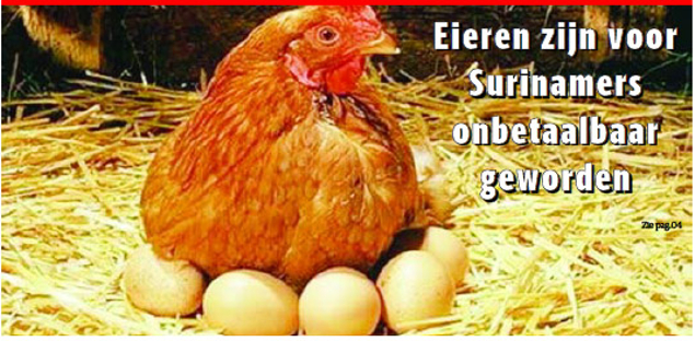 Surinamers kunnen zich geen eieren meer veroorloven door de gestegen verkoopprijzen. Kostte een ei voorheen SRD 0,50, tegenwoordig moet men 8 tot 9 SRD uitgeven voor één ei.