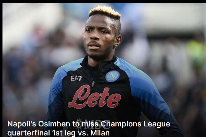 Napoli heeft aangekondigd dat hun sterspits Victor Osimhen de heenwedstrijd van woensdag in de kwartfinale van de Champions League tegen AC Milan zal missen vanwege een dijbeenblessure die hij opliep tijdens internationale dienst. Osimhen was in een race tegen de klok verwikkeld om in de wedstrijd te spelen, maar herstelde zich niet op tijd. Als gevolg hiervan zou de Italiaanse international Giacomo Raspadori zijn plek in de selectie kunnen innemen, hoewel Napoli ook aankondigde dat Giovanni Simeone een hamstringblessure had opgelopen en niet beschikbaar is.