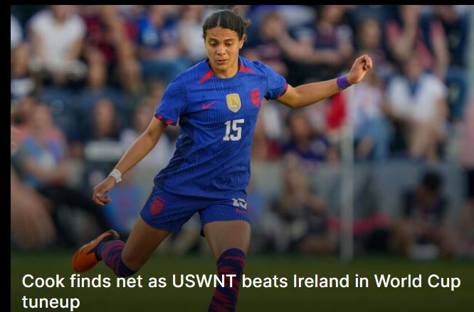 Op dinsdagavond versloeg het US Vrouwen Nationale Team Ierland 1-0 in een oefenwedstrijd om zich voor te bereiden op het Wereldkampioenschap voetbal voor vrouwen. Alana Cook scoorde haar eerste internationale doelpunt op haar 26e verjaardag. Mallory Swanson, de beste scorer van de VS dit jaar met zeven doelpunten, liep zaterdag tijdens het spel tegen Ierland een gescheurde kniepees aan haar linkerknie op en is onwaarschijnlijk om mee te doen aan het WK. Alyssa Thompson, een 18-jarige aanvaller die dit seizoen was gedraft, begon in de wedstrijd, terwijl Rose Lavelle niet speelde vanwege een blessure. De VS eerde Becky Sauerbrunn voor haar 200e optreden bij het team. De VS zal een afscheidswedstrijd spelen tegen Wales op 9 juli in San Jose, Californië, voordat ze vertrekken naar het WK, dat op 20 juli in Australië en Nieuw-Zeeland begint.