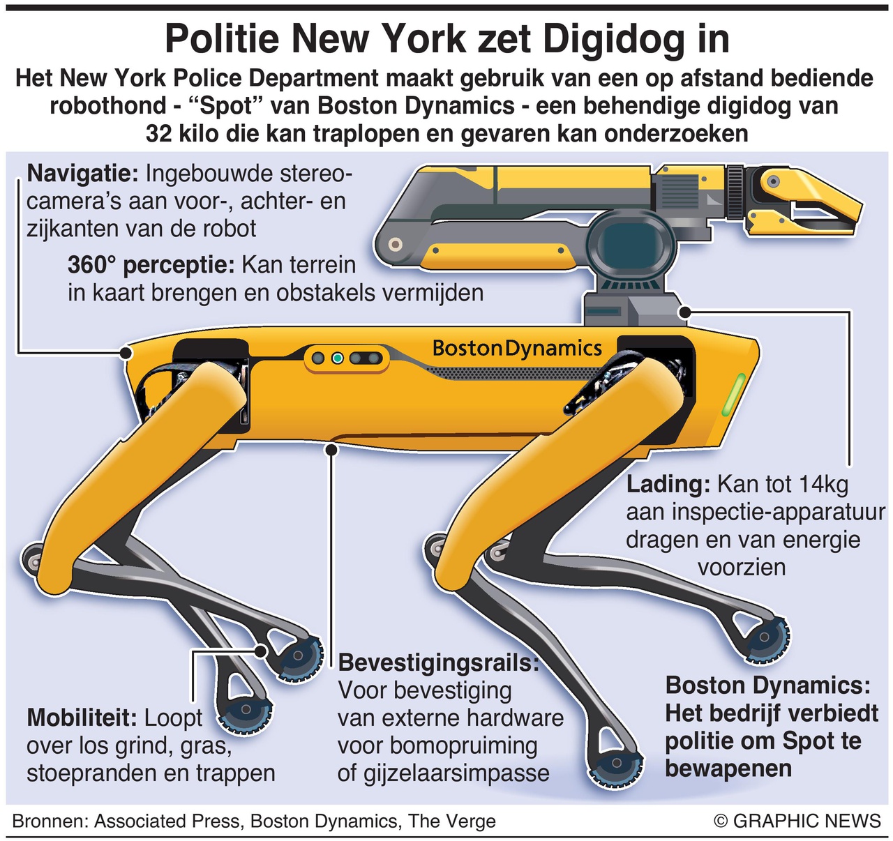 “Digidog is uit het pond”, zei de burgemeester van New York, Eric Adams, een democraat en voormalig politieagent. “Digidog maakt nu deel uit van de toolkit die we gebruiken”, zei burgemeester Adams tijdens de persconferentie van dinsdag (11 april).