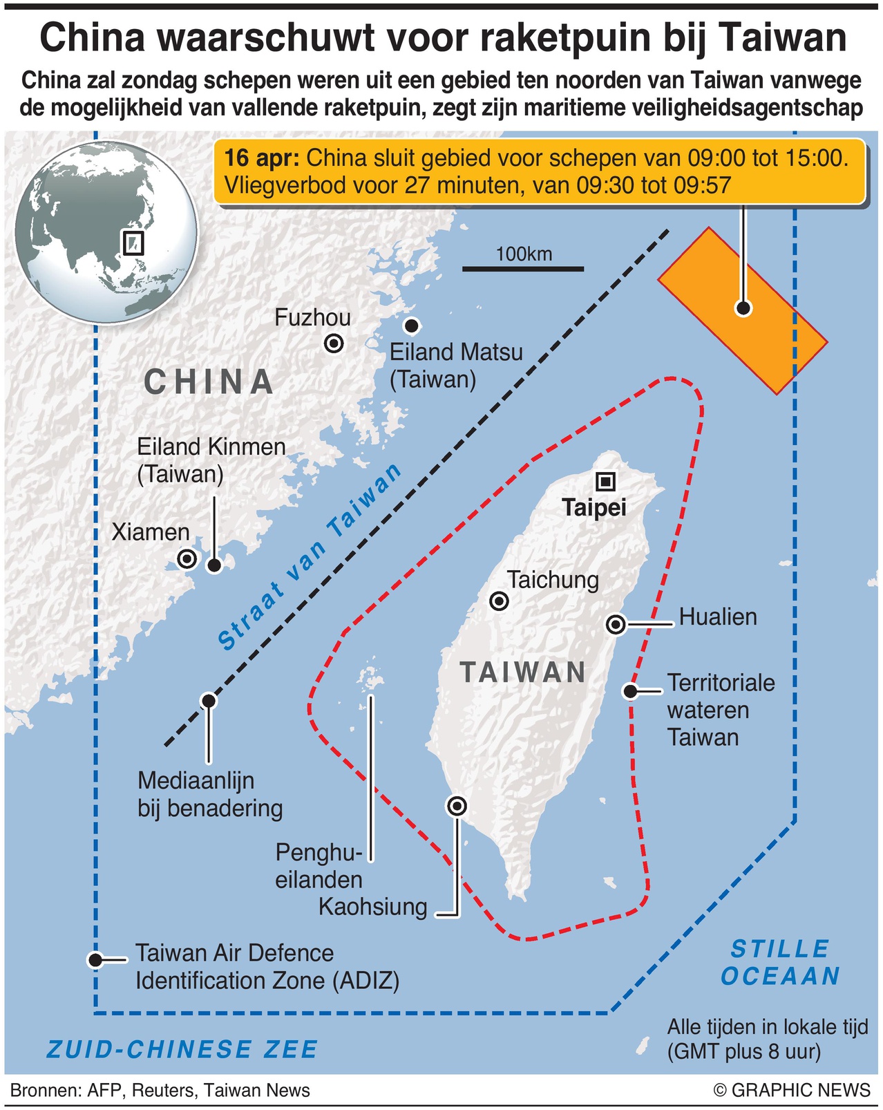 Het gebied rond 160 km van de Taiwanese hoofdstad Taipei, zal worden gesloten van 9.00 uur (01.00 uur GMT) tot 15.00 uur (07.00 uur GMT), zei de maritieme veiligheidsadministratie van de oostelijke provincie Fujian in China donderdag.