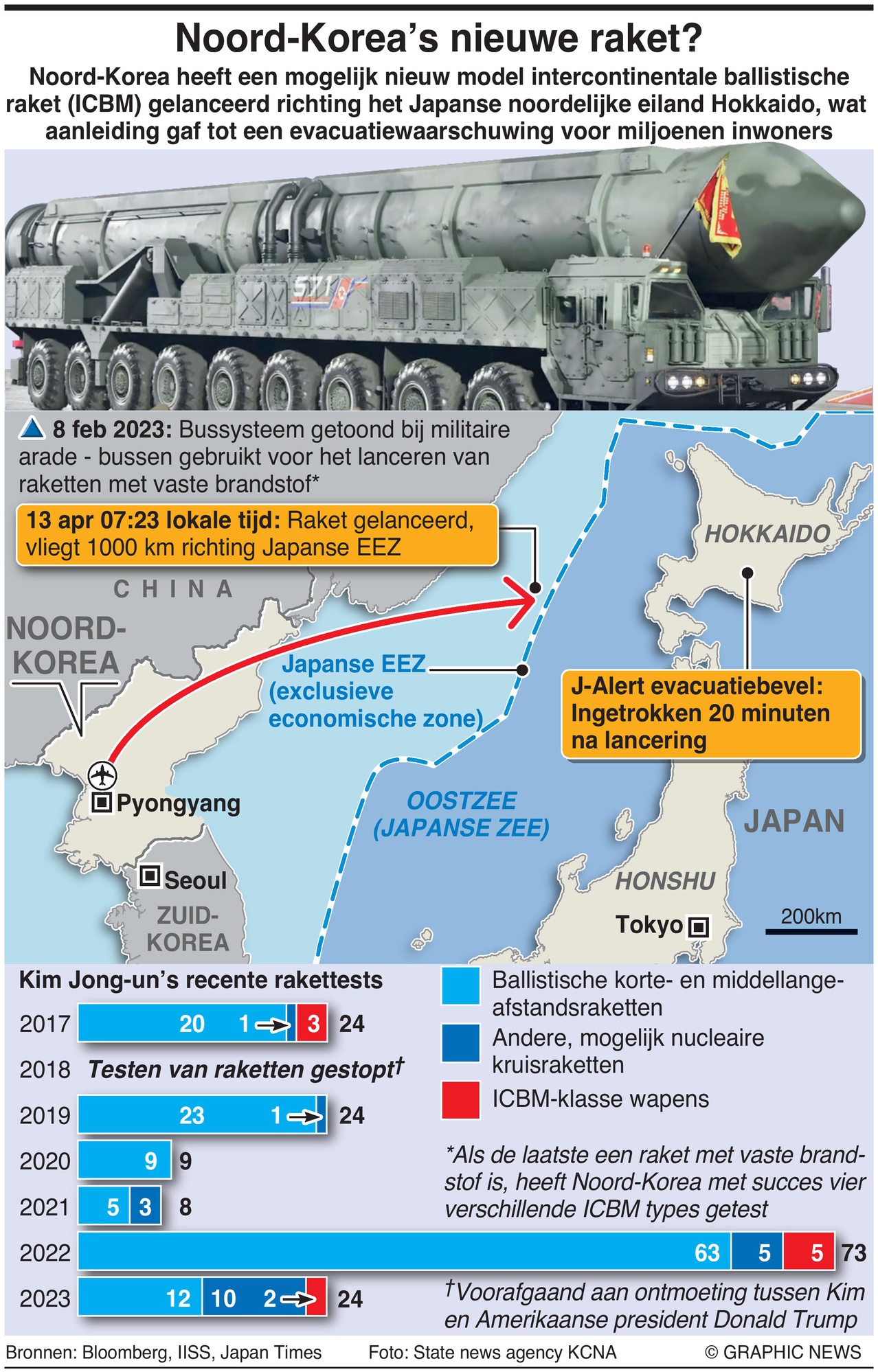 13 april 2023 – Noord-Korea lanceerde een mogelijk nieuw model intercontinentale ballistische raket (ICBM) richting het noordelijke eiland Hokkaido in Japan, wat leidde tot een evacuatiewaarschuwing voor miljoenen inwoners.