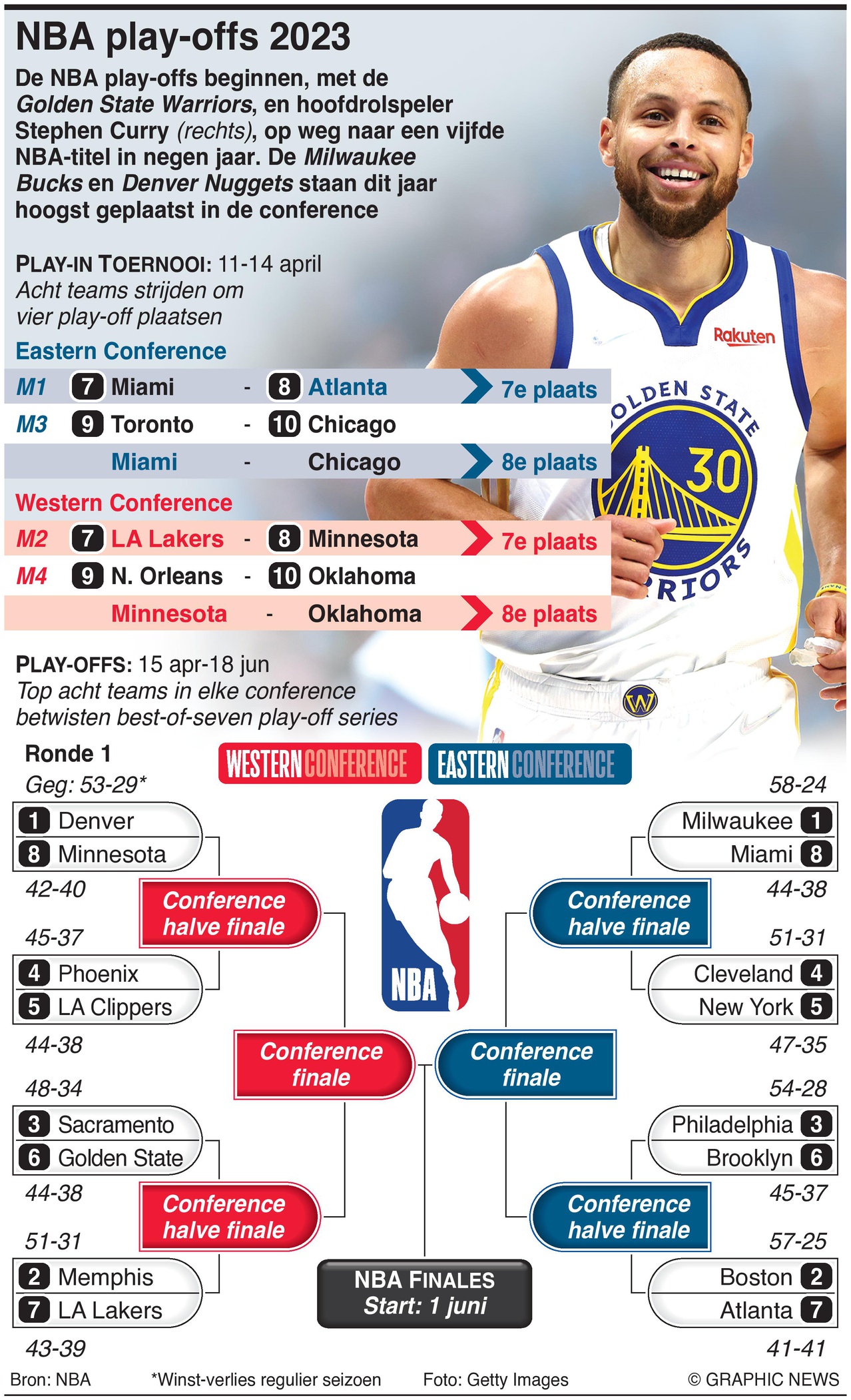11 april 2023 – 18 juni 2023 – De NBA-play-offs, het hoogtepunt van het seizoen van de National Basketball Association in Noord-Amerika, gaan van start. De NBA-play-offs beginnen, met de Golden State Warriors en hoofdrolspeler Stephen Curry, die mikken op een vijfde NBA-titel in negen jaar. De Milwaukee Bucks en Denver Nuggets staan dit jaar aan het hoofd van de conferentiezaden.