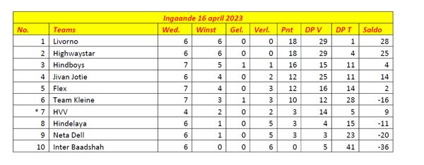 De competitie wordt op 23 april voorgezet met de wedstrijden: Hindelaya – Jivan Jotie, Flex – Highwaystar, Neta Dell – Interbaadshah, en Team Kleine – Livorrno